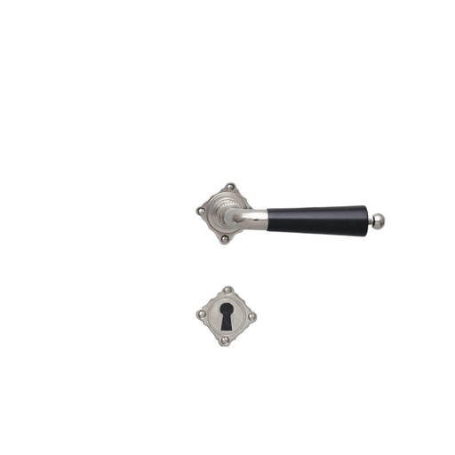 Ovenpainike, Björkboda 25, koristeellinen malli, vanhaan oveen, niklattu messinki ja musta puukahva, avainkilvillä