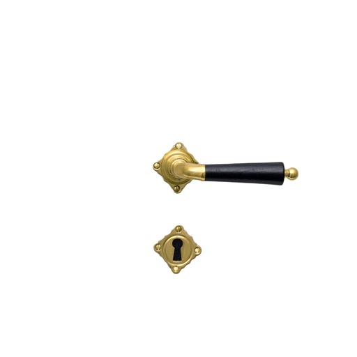Ovenpainike, Björkboda 25, koristeellinen malli, vanhaan oveen, messinki ja musta puukahva, avainkilvillä