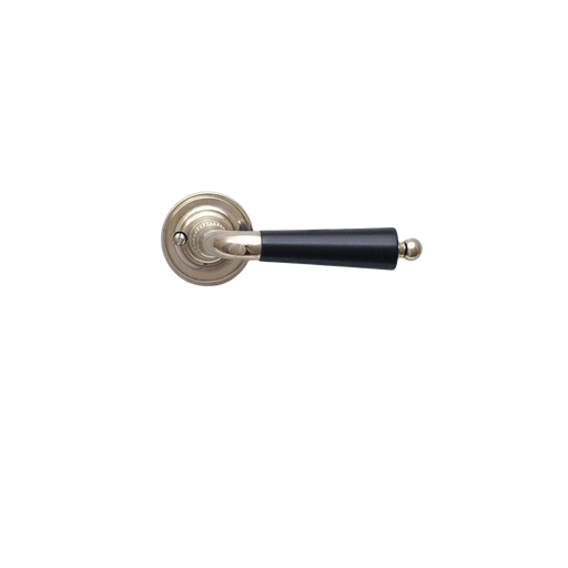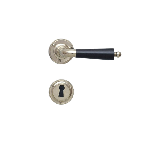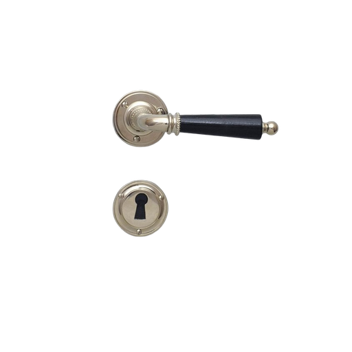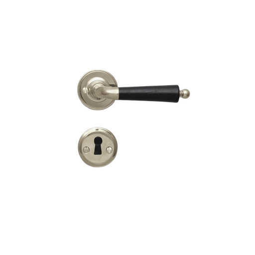 Ovenpainike, Björkboda 25, yksinkertainen malli, uuteen oveen, niklattu messinki ja musta puukahva, avainkilvillä