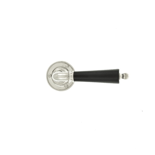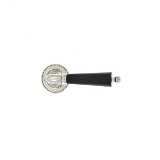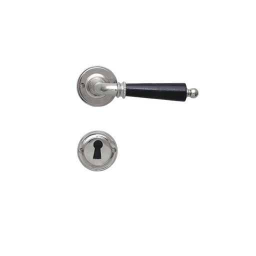 Ovenpainike, Björkboda 25, koristeellinen malli, uuteen oveen, niklattu messinki ja musta puukahva, avainkilvillä