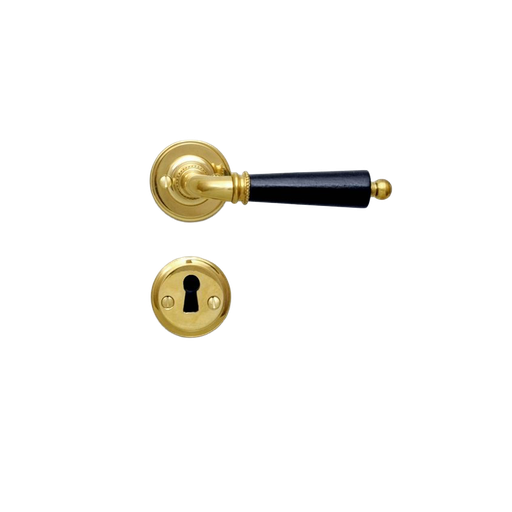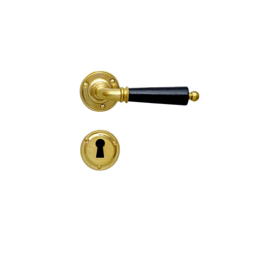 Ovenpainike, Björkboda 25, koristeellinen malli, uuteen oveen, messinki ja musta puukahva, avainkilvillä